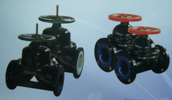 襯膠、襯塑、搪瓷隔膜閥是一種特殊形式的具有截?cái)喙δ艿拈y門,其啟閉件由鋼質(zhì)閥瓣與軟質(zhì)材料(橡膠和氟塑料復(fù)合)制成的隔膜組成,并將閥體內(nèi)腔隔開以達(dá)到截?cái)喙軆?nèi)介質(zhì)之目的。基本結(jié)構(gòu)1、復(fù)合隔膜將閥體下部腔與閥蓋內(nèi)腔隔開,并與之形成直流通道,使隔膜上部的閥桿,閥瓣等內(nèi)件與介質(zhì)完全隔離,省去填料密封結(jié)構(gòu),介質(zhì)的內(nèi)漏和外漏可同時(shí)避免。